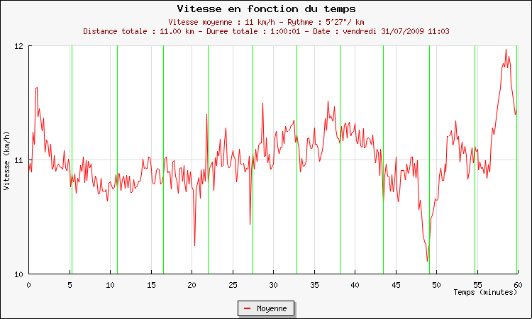 Je trouve que mon rythme était correct, oscillant autour de 11km/h, par contre, j’ai peur que ce résultat soit un peu faux, car Nike+ mesure 11km tout pile parcouru, alors que Google Maps m’indique 12km !