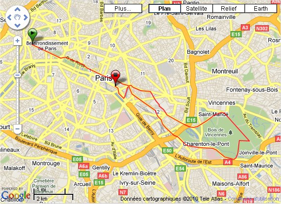 Le 11 avril 2010, même si je suis préparé à un éventuel abandon, je me présente avec le vide dans ma tête. Mon objectif qui est d’égaler mon score de l’édition passée est revu à la baisse : simplement terminer. Au départ tout se passe bien, j’essaie de suivre une allure de 5’30 » au km mais déjà dans le bas des Champs Elysées, je commence à ressentir l’écho d’une douleur à la hanche.