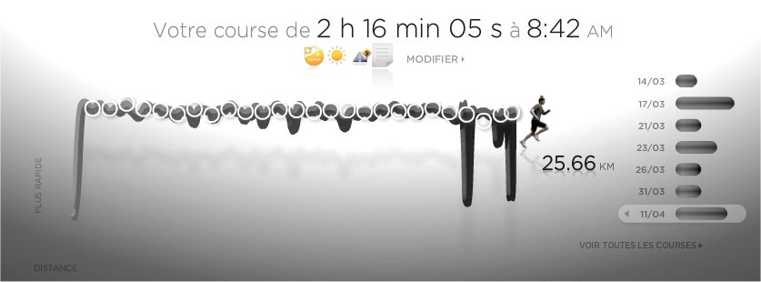 Les données doivent changer au mois de décembre 2009 lorsque je dois faire un break suite à une blessure au mollet. La reprise fin janvier est difficile : les sorties de 20 km deviennent pénibles malgré l’alternance de mes activités avec le vélo. L’espoir revient le 7 mars 2010 lorsque l’épreuve du semi marathon de Paris est remportée avec 2’25 » de plus que l’an passé (satisfaisant en raison de mon interruption d’entraînement). Puis je boucle une sortie de 29 km et constate qu’il me reste de la ressource. Je me dis alors que ça peut encore bien se passer pour l’épreuve du 11 avril.