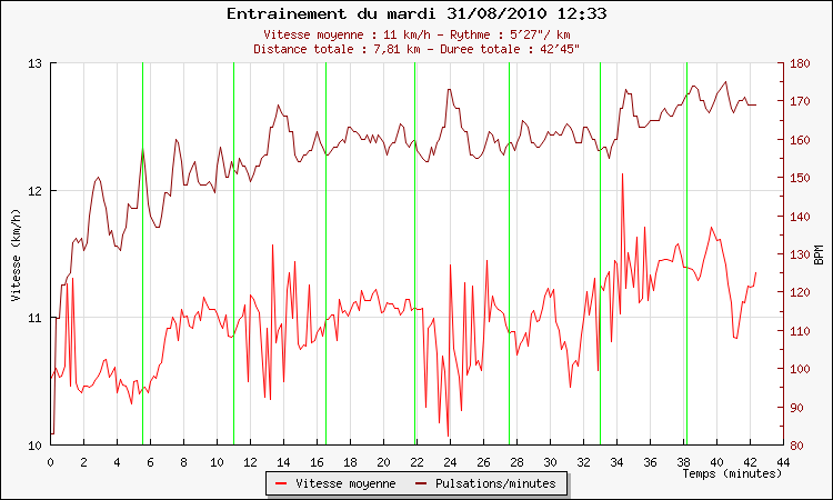 Quand je sorts le matin, les pulsations montent pas trop (133 pour 9.4 de moyenne)