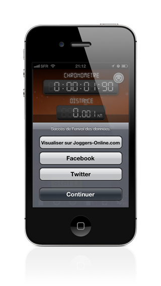 Lorsque la session est terminée par un glisser du doigt sur le bouton stop, une pop up apparaît et vous propose de nouvelles possibilités : la consultation de votre sortie sur le site ainsi que son partage sur Twitter ou Facebook.