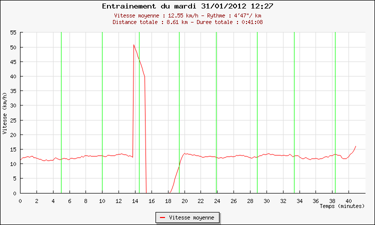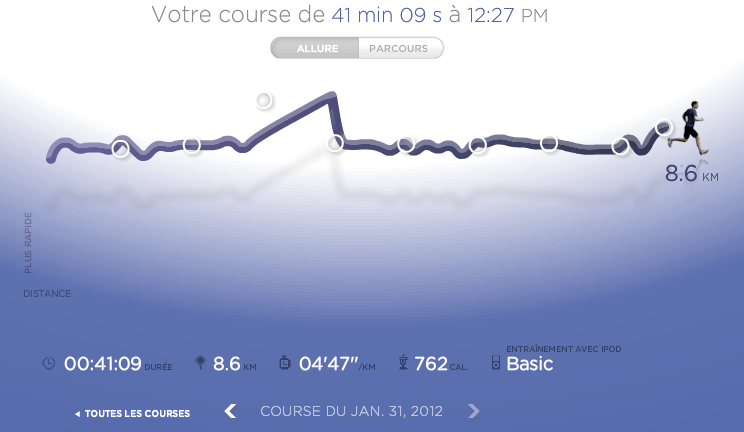 Par contre, petit bug d’importation de mon run sur Nike+, toutes les valeurs sont correctes, mais je n’explique pas ce gros pic suivit d’une vitesse nulle au milieu de la sortie 🙁