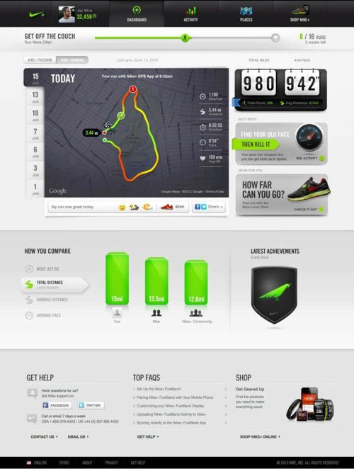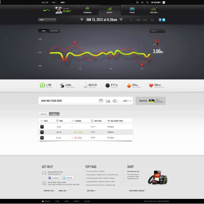 Posté par Djailla - Services web, Technologie 4 mars 2012Le site nikerunning.com a été lancé il y a presque 6 ans en même temps que le kit Nike+iPod et servant d’interface pour visualiser ses entrainement. Malgré son grand âge et son adoption par de nombreux coureurs (moi le premier), il n’a jamais bénéficier d’une bonne mise à jour, conservant toujours son interface en Flash, lourde et lente ! Mais cette été, pour ce 6ème anniversaire, les choses vont changer !