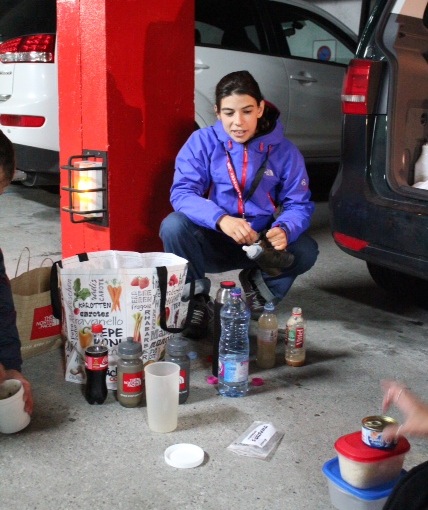 Maintenant que le champ est libre, c’est parti ! Une fois les coureurs tous sortis de l’aire de départ, nous nous dirigeons vers la voiture d’assistance pour rejoindre le premier point de ravitaillement à St Gervais. La nuit commence à tomber, la pluie aussi 🙁 Il faut apprendre à se mette en place pour préparer la nourriture et les boissons selon les consignes de Fernanda mais aussi estimer les temps de passage pour ne pas avoir à trop attendre statique dans le froid.