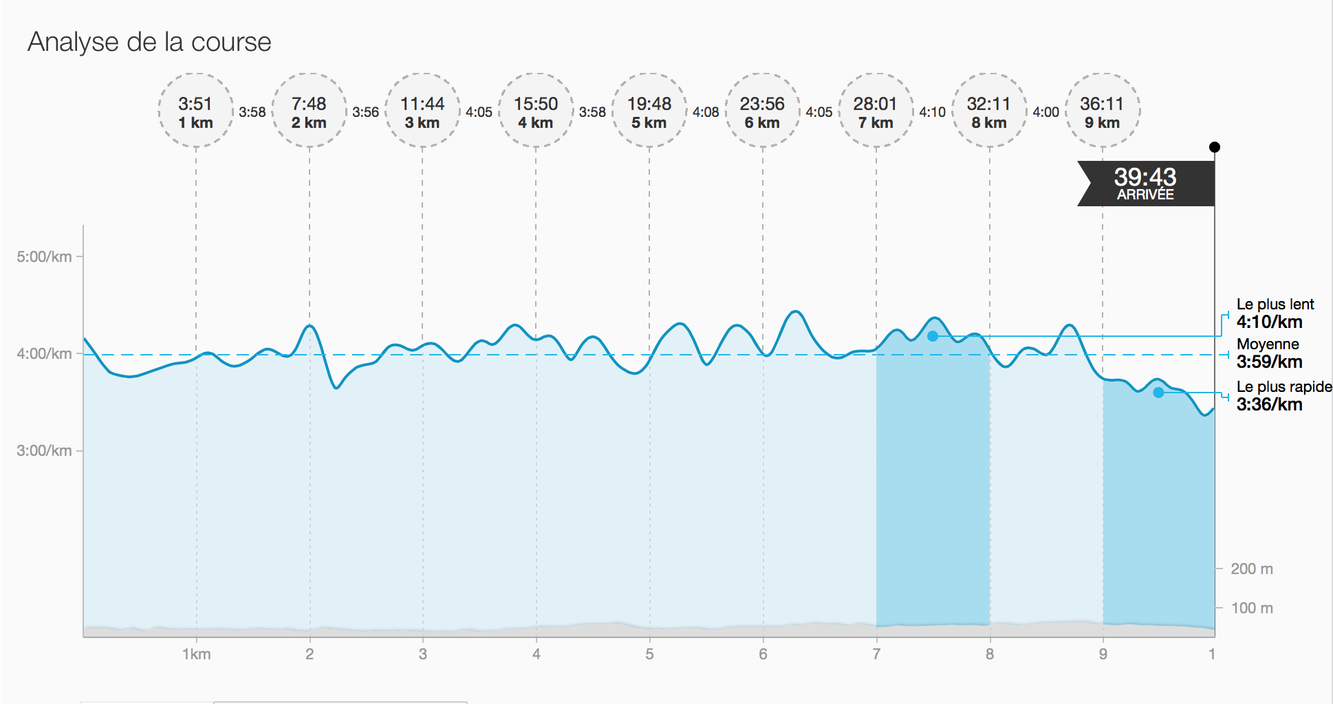 Le départ se déroule sans encombres, partir dans un sas est vraiment un privilège et je me cale donc sur mon allure cible. Pour 40 minutes, c’est très, pas besoin de se faire des noeuds au cerveau, il faut juste retenir la table de 4 !
