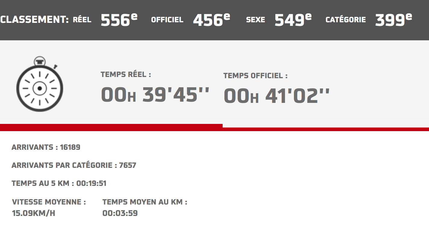 Et qu’elle n’est pas ma surprise en passant le portique ! En plus d’avoir rattrapé mon retard, j’ai même grappillé de précieuses secondes, au moins 15 !!! Ce qui fait un dernier kilomètres en 3’35 😀