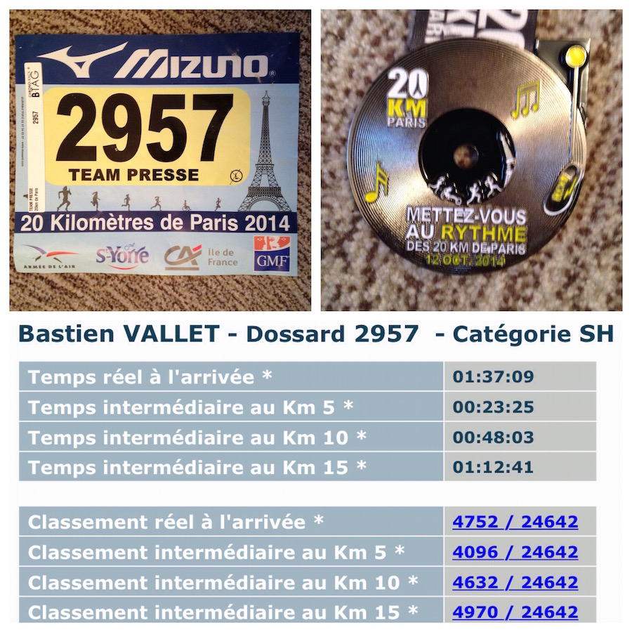 Posté par Djailla - Course, Route, Running, Sorties 23 octobre 2014Les 20km de Paris, c’est un peu ma course, 5 inscriptions, 4 participations ! Alors même si pour cette cuvée 2014, je n’ai pas pu m’entraîner correctement, la faute à un mariage et 3 semaines de voyage de noce en Afrique du Sud, j’étais quand même, moins de 24h après mon atterrissage, sur la ligne de départ de ce monument sacré du running français.